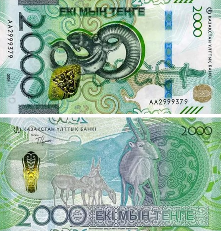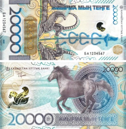 • Аверс: Конь — символ свободы, духа и силы в казахской культуре. Банкнота оформлена в насыщенных сине-фиолетовых тонах, с золотым орнаментом, спиралью ДНК и деталями «Древа жизни».