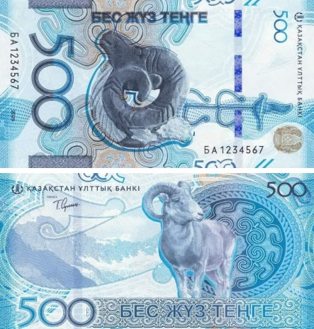 500 тенге (2025) — Урал: символ упорства и выносливости• Аверс: Доминирующим элементом выступает голова урала (горного барана) в профиль — животного, символизирующего устойчивость, грацию и силу. На фоне — ДНК-спираль, подчёркивающая тему наследия. Дополнительно изображены ветвь «Древа жизни» и птица Самрук, заимствованные из головного убора «Золотого человека», а также герб Казахстана.
