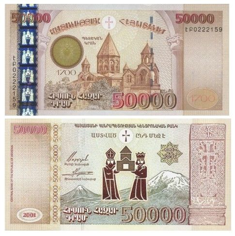 Юбилейная банкнота номиналом 50 000 драмов, выпущенная Центральным банком Армении в 2001 году, стала важной вехой в истории армянской нумизматики. Она была создана в честь 1700-летия принятия христианства в качестве государственной религии — события, которое сделало Армению первой страной в мире, официально принявшей христианство.