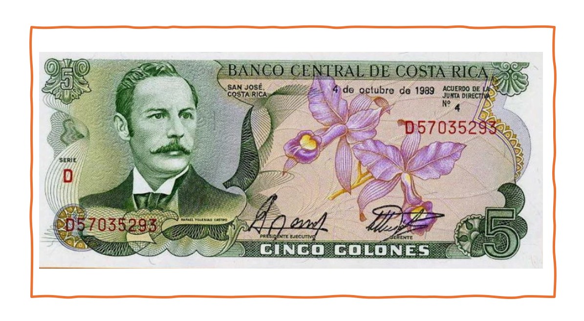 Слева от портрета изображена орхидея Guaria Morada - национальный цветок Коста-Рики.