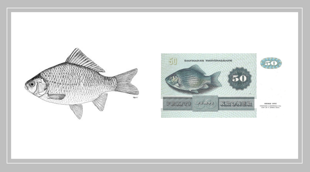 На обороте - карась золотой, типичный обитатель датских озёр. Его округлая форма и серебристые чешуйки на фоне защитного орнамента создают особую гармонию с холодными тонами банкноты.