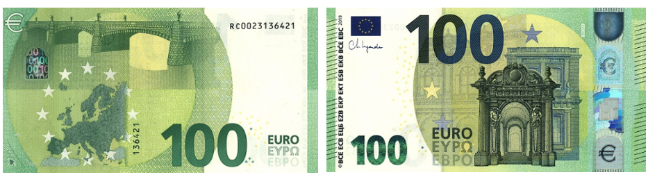 Банкнота номиналом 100 евро из серии «Европа» была выпущена в 2019 году с подписью Кристин Лагард. На лицевой стороне изображены элементы барочной и рококо-архитектуры, а на обороте — мост в том же стиле и карта Европы. Купюра зелёного цвета, содержит расширенный набор защитных элементов: голограмму с портретом Европы, прозрачное окно, защитную нить и УФ-метки.