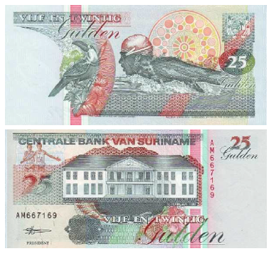 На оборотной стороне банкноты изображен Здание центрального банка Суринама