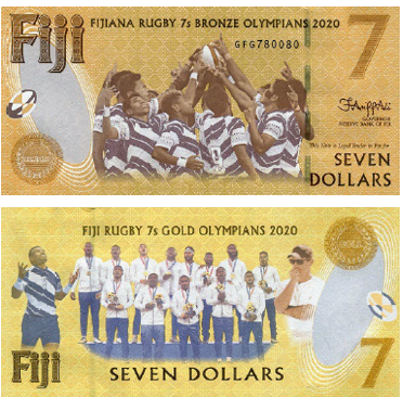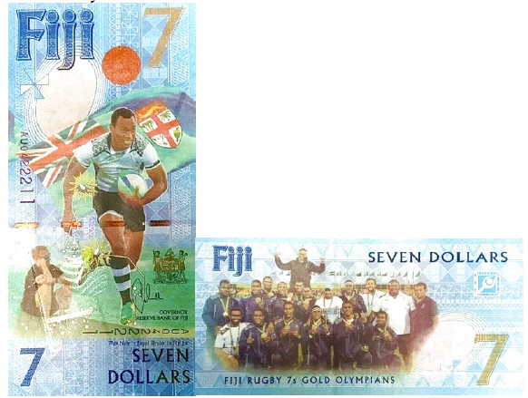 На лицевой стороне банкноты изображен Бен Райан – английский спортивный тренер и Осеа Колинисау, капитан сборной Фиджи, несший флаг своей страны на церемонии открытия на стадионе «Маракана», привел сборную к блестящему золоту по регби-7 в Рио-2016, где этот вид спорта вернулся в программу Олимпийских игр после 92-летнего отсутствия.