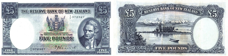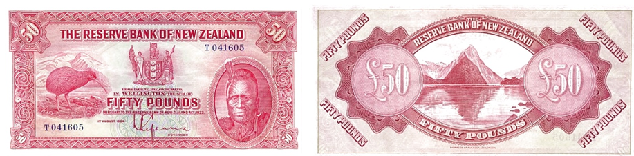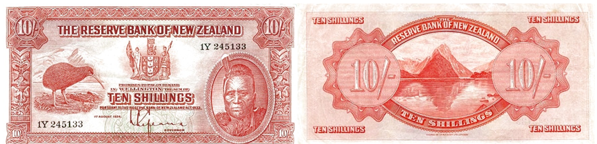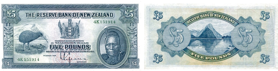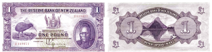 Официально первая серия банкнот новозеландского фунта, введённая в обращение 1 августа 1934 года, называется “Maori” Pound Issue. Она стала первым выпуском, осуществлённым Резервным банком Новой Зеландии, и отличалась унифицированным дизайном: на аверсе — символическая композиция с птицей киви, гербом и портретом маорийского короля Таухиао, а на реверсе — пейзаж Милфорд-Саунда и пика Митр.