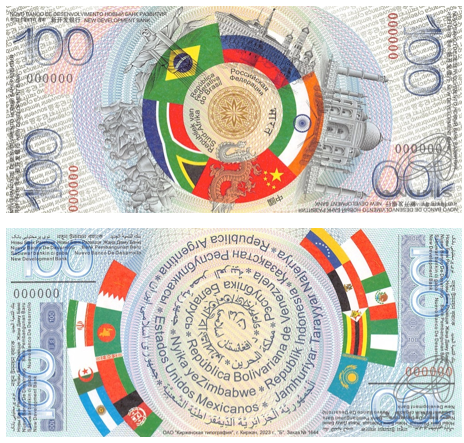 Банкнота БРИКС — это сувенирная купюра, выпущенная ограниченным тиражом (10.000) и не являющаяся платёжным средством. Её задача - выразить идеи равенства, сотрудничества и многополярности, лежащие в основе философии объединения БРИКС (Бразилия, Россия, Индия, Китай, Южно-Африканская Республика).Купюра выполнена на высочайшем полиграфическом уровне, с использованием тех же технологий, что применяются при печати официальных валют других государств.