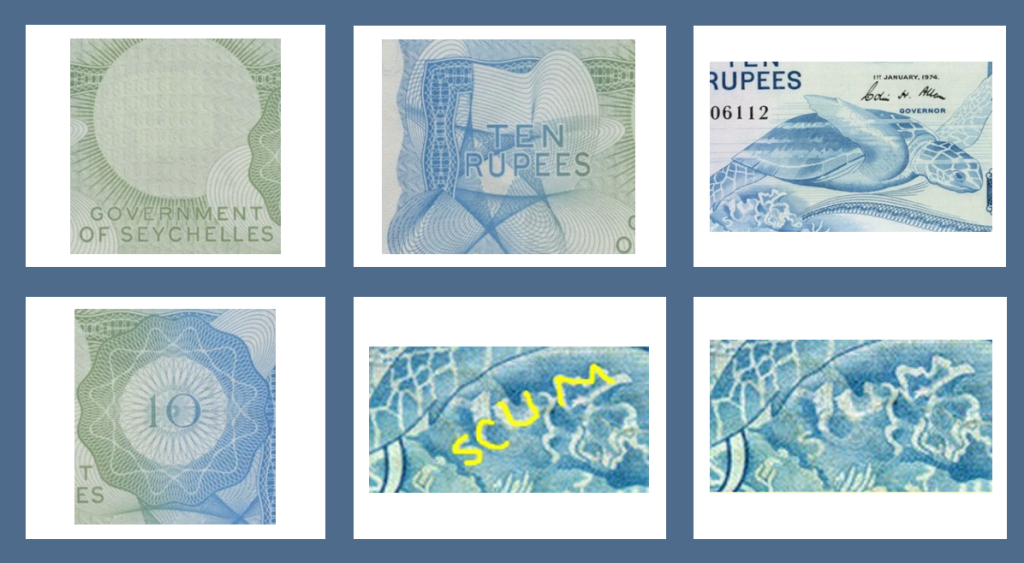 Интересный факт: получила известность как «SCUM note» из-за визуальной иллюзии в орнаменте, где при определённом освещении можно различить это слово,оптическая иллюзия в растительном орнаменте позади черепахи: при определённом угле восприятия и сочетании линий можно прочесть слово SCUM («подонки»), что породило массу слухов и легенд о политическом подтексте дизайна.