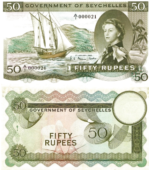 Примечание: номинал символизирует морское наследие Сейшел, их связь с океаном, торговлей и рыболовством.