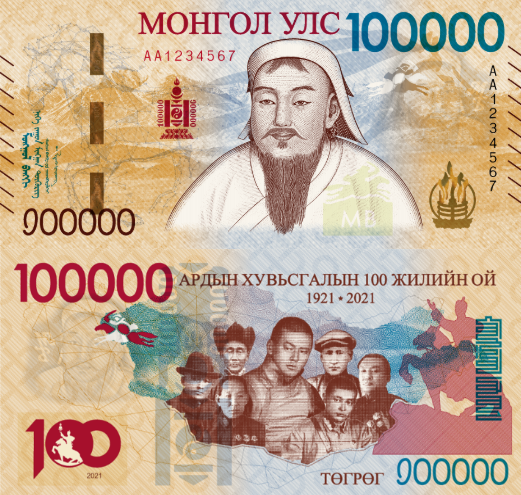 2025 год - памятный выпуск 100 000 тугриков к столетию национальной валюты.