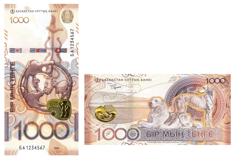 Рядом размещён золотой орнамент сакской эпохи, а также изображения отдыхающей среднеазиатской овчарки и стоящей тазы (казахской борзой) традиционных символов силы, охраны и верности.