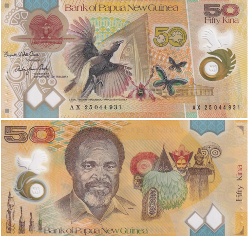 Банк Папуа - Новой Гвинеи (Bank of Papua New Guinea) представил в 2025 году памятную полимерную банкноту номиналом 50 кина, посвящённую 50-й годовщине провозглашения независимости страны (1975) и создания национальной валюты — кины.Новая серия стала символом единства и культурного богатства государства, подчеркнув важность сохранения природного и исторического наследия.