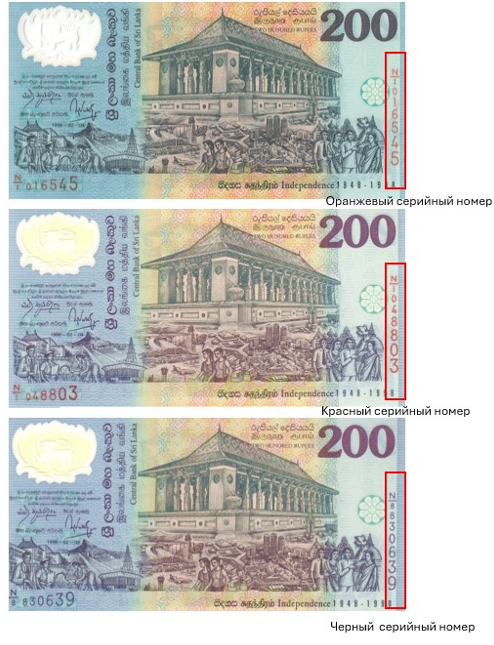 Существует три разновидности этих банкнот, отличающихся цветом серийного номера: