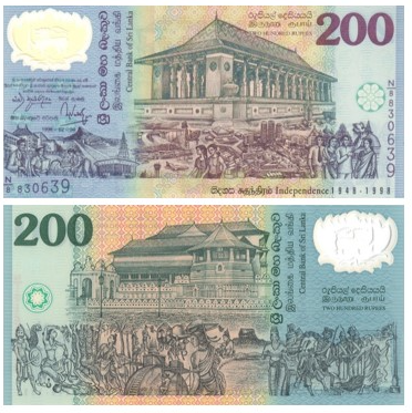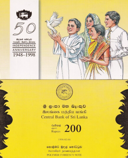 В честь 50-летнего юбилея независимости (1948–1998) Центральный банк Шри-Ланки выпустил памятную банкноту номиналом 200 рупий. Этот выпуск не только отмечал важное историческое событие, но и стал одним из первых примеров использования полимерных банкнот в стране.
