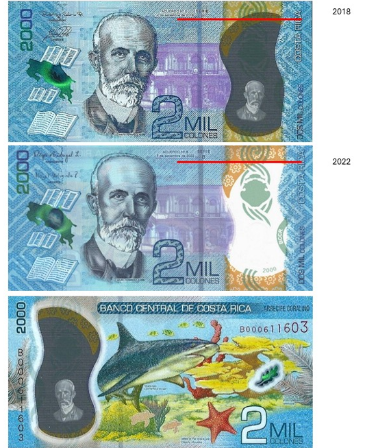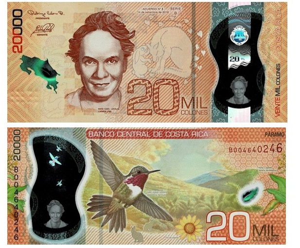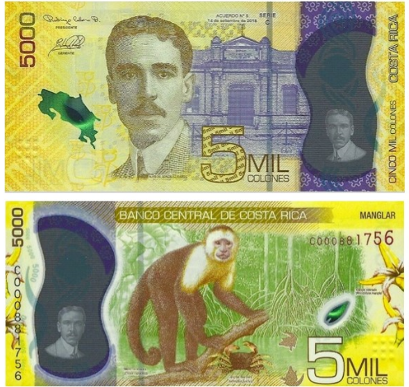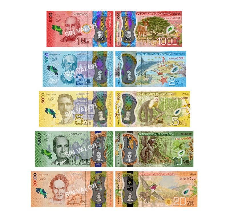 В 2020–2021 годах Центральный банк Коста-Рики завершил масштабную денежную реформу — все купюры страны номиналом 1 000, 2 000, 5 000, 10 000 и 20 000 колонов были переведены с хлопковой бумаги на прочный и экологически чистый полимер. Эти банкноты отличаются высокой устойчивостью к влаге, износу, а также включают современные элементы защиты: большие прозрачные окна, голограммы, цветоизменяющие элементы и усовершенствованные защитные нити.