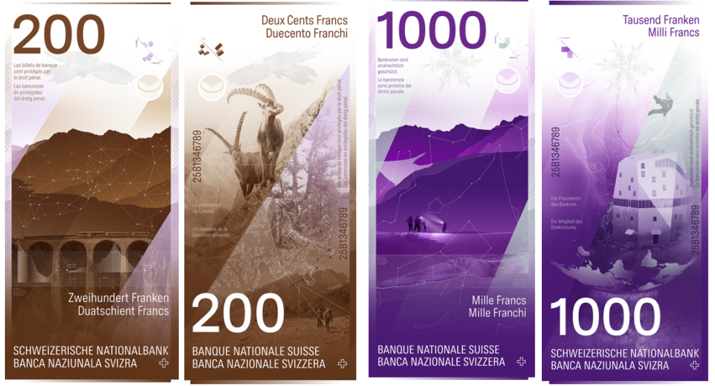 Диагональная композиция каждой купюры символизирует путь солнца: от его низшей точки зимой (низменности) до высшей точки летом (Альпы). На оборотных сторонах изображён аналимма солнечная восьмёрка, показывающая положение солнца в разные времена года. Каждый номинал символизирует определённое время суток, а цветовая гамма передаёт световую атмосферу момента.
