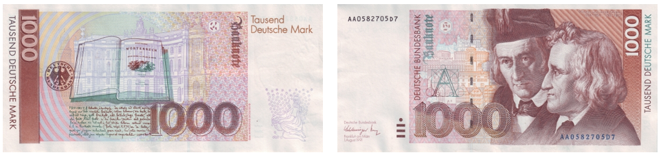 На лицевой стороне банкноты изображены Якоб и Вильгельм Гримм – братья-неразлучники и строгие собиратели немецкого фольклора. Юристы по образованию и лингвисты по призванию, братья считали свои сказки поучительными и обижались, если их называли чересчур жестокими. С их именем связан наиболее полный сборник немецких волшебных историй, изданный в 1812 году. Братья много сделали не только для культуры собственной страны, но и заложили основы изучения фольклора вообще.