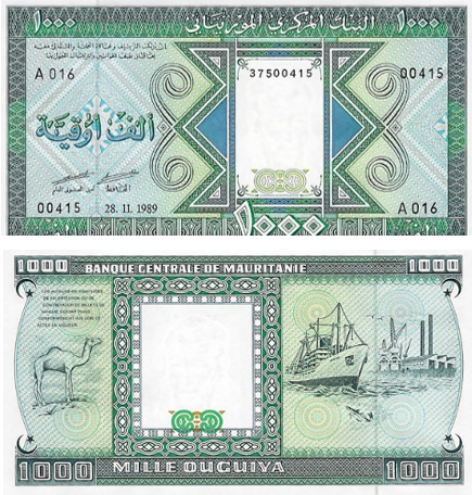 В середине 1980-х годов в Мавритании были подготовлены к выпуску две разновидности банкнот номиналом 1 000 угий. Оба варианта были полностью отпечатаны и имели все признаки законного платёжного средства, однако по неизвестным причинам так и не вышли в обращение. Лишь спустя десятилетия эти редчайшие экземпляры стали известны нумизматическому сообществу.