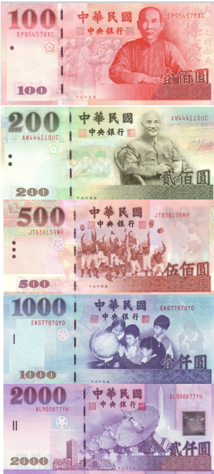 Сегодня на банкнотах NT$100 и NT$200 изображены Сунь Ят-сен (основатель Китайской Республики) и Чан Кайши (лидер Гоминьдана).
