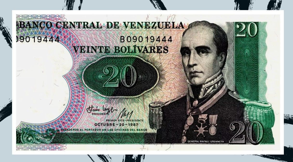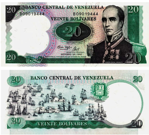 Памятная банкнота номиналом 20 боливаров была выпущена в 1987 году и посвящена двухсотлетию со дня рождения генерала Рафаэля Урданеты, одного из национальных героев Венесуэлы.