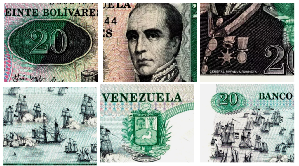 На оборотной стороне представлена детализированная гравюра, изображающая Битву при озере Маракайбо, состоявшуюся 24 июля 1823 года. Это решающее морское сражение стало символом окончательной победы венесуэльских патриотов над испанским флотом и закрепило независимость страны. На сцене изображены парусные корабли, артиллерийские залпы и волны, передающие динамику и драматизм сражения. В правой части банкноты помещён герб Венесуэлы, подчеркивающий её национальное значение.