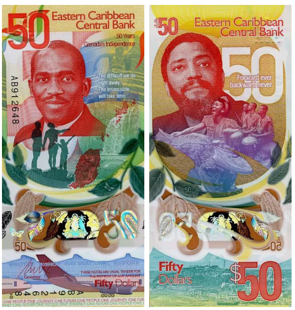 В июне 2024 года Восточно-Карибский Центральный Банк (ECCB) выпустил памятную банкноту номиналом 50 долларов, посвящённую 50-летию независимости Гренады. Этот красочный выпуск вызвал интерес не только у жителей региона, но и у коллекционеров по всему миру благодаря редкому оформлению, современной полимерной основе и множеству культурных и исторических деталей.